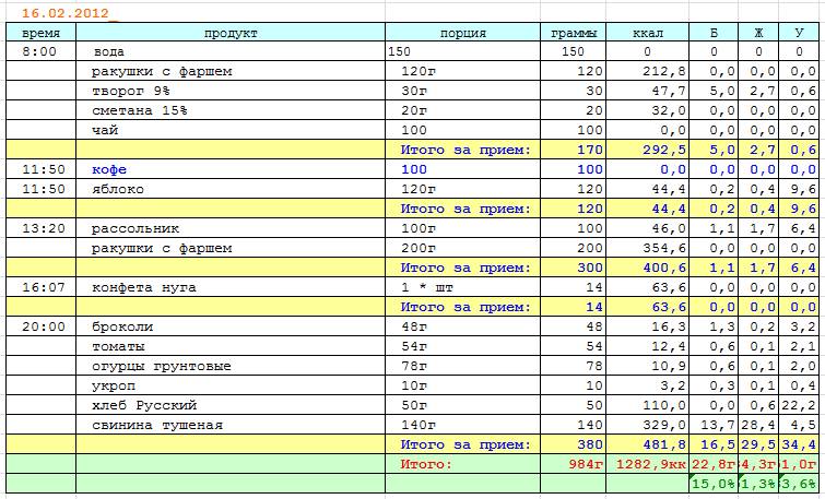 Ну и вот мое сегодняшнее меню. Никак не могу разобраться с балансировкой БЖУ, жиров многовато по-моему, и с распределением пищи на равные части по каллориям пока не выходит