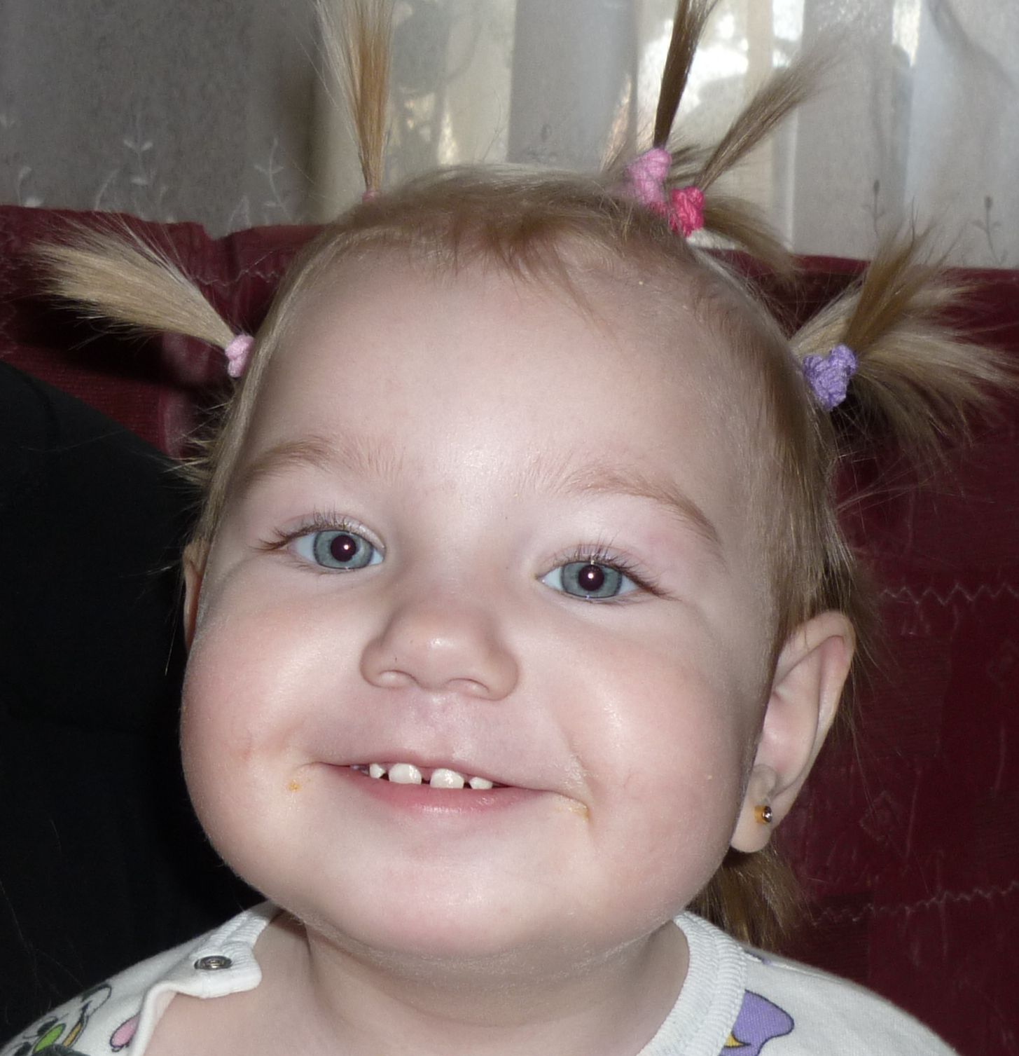 Дочка чудо. Прическа просто класс. Нам 1,9, но я никак не дождусь чтобы можно было бы такие хвостики делать. Сзади вроде бы отросли уже, а спереди еле-еле.