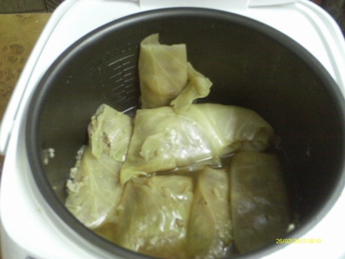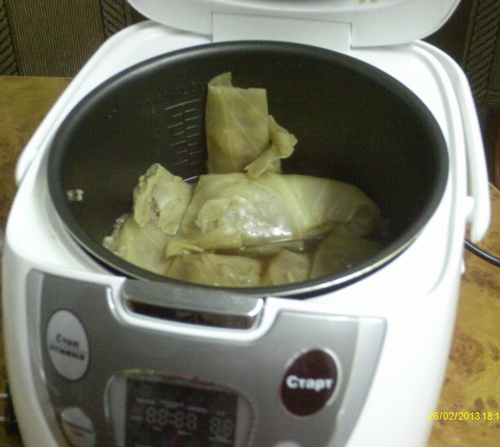 Вот мои голубцы в мультиварке. Вчера с вечера сделала голубцы и убрала в холодильник. Утром все загрузила в кастрюльку мульти и заполнила водой холодной, соль и 1 ст. ложку томатной пасты. Установила режим "Тушение" на 90 минут, объясню почему так: в книжке написано делать голубцы с сырым рисом и ставить на 90 минут при этом воды должно быть в два раза больше. Я рис отварила и за счет этого убавила обьем воды, чтобы больше было голубцов, но время решила не убавлять, боялась не до варится капуста. А так 60 минут должно хватить, в следующий раз так и сделаю. Теперь самое главное - функция "Таймер" работает  . Поставила таймер на 9.00 часов, чтобы готовить она начала в 16.00 и к моему приходу (в 18.00) была уже почти готова. Я опасалась, что может за это время скиснуть, нет все хорошо  ! К моему приходу ужин был готов, я поела, накормила семью и ушла в парк, час на лыжах каталась. Отличная вещь, я рада что купила ею!!!