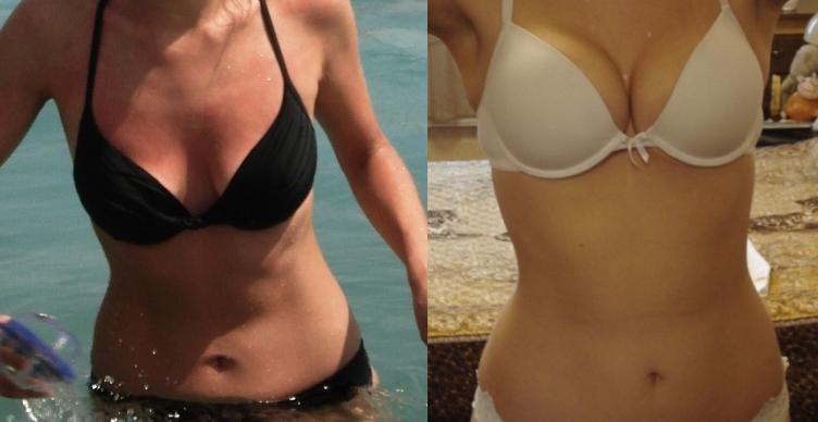 или жировой упитанный животик со складкой посередине, НО грудь на 2 размера больше... красиваяяяя...