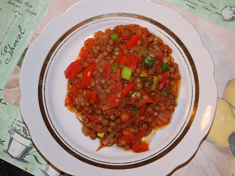 Вымыть чечевицу, поставить вариться. Время варки смотрите на упаковке, у разных сортов оно разное. Моя, судя по упаковке, варится 20 минут. Я еще пробую и этим регулирую время, так что возможно варила и дольше. Чечевицу рекомендуется солить в конце варки. Я в этот раз вообще не солила, я посолила овощи.