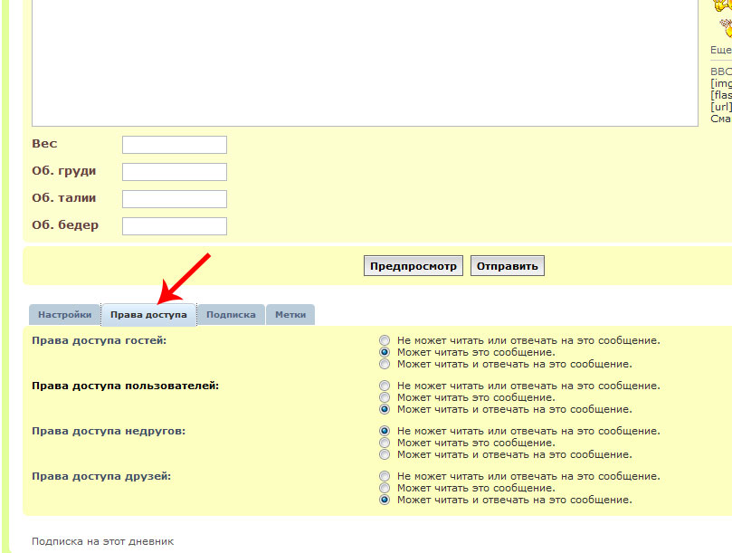 По умолчанию все записи в дневнике будут иметь "уровень секретности", как выставлено в настройках дневника, но в то же время вы можете переопределить права доступа, когда пишите в дневник любую запись.