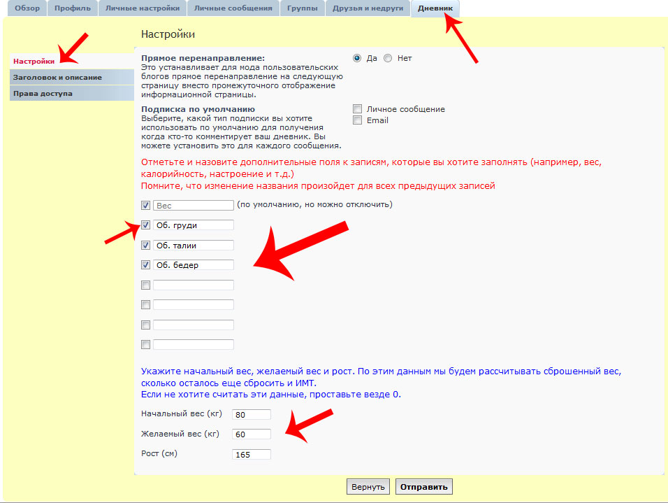 Также на изображении видно, что есть Начальный вес, Желаемый вес, Рост. Если вы заполните эти данные, то при указании веса в записи дневника вам рассчитается Сколько уже сброшено кг, сколько осталось кг и какой ИМТ (индекс массы тела) у вас сейчас. Если вы не хотите, чтобы это все рассчитывалось просто проставьте 0 в полях Начальный вес, Желаемый вес, Рост