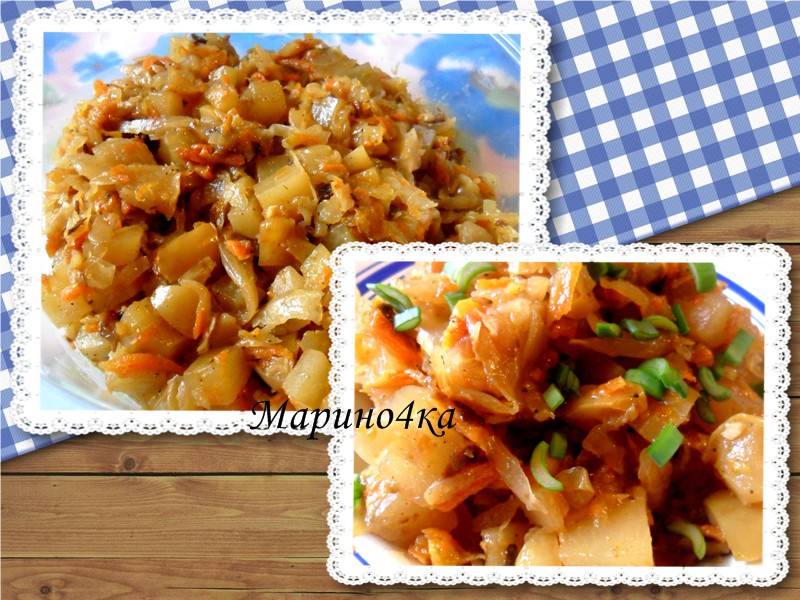 Нашла тут http://www.povarenok.ru/recipes/show/63815/ рецептик и вчера приготовила...Ну очень вкусно!Рекомендую... Ингредиенты для "Постное рагу с квашеной капустой и сухофруктами" Картофель — 6 шт Морковь — 1 шт Лук репчатый — 1 шт Сельдерей (немного) Капуста квашеная — 250 г Яблоки (зелёные, небольшие) — 2 шт Чернослив — 3 шт Курага — 3 шт Масло растительное (для жарки) Чеснок — 2 зуб. Тмин — 1 ч. л. Соль (по вкусу) Перец чёрный молотый (по вкусу) Лавровый лист — 2 шт Зелень (немного, для подачи) Рецепт "Постное рагу с квашеной капустой и сухофруктами" В посуде с толстыми стенками (у меня старенькая гусятница), обжариваем нарезанные соломкой морковь и сельдерей. Добавляем лук, нарезанный также соломкой. Картофель чистим, моем, нарезаем крупными кусочками. Кладём к овощам. Обжариваем вместе минут 5. Кладём нарезанные яблоки. Я от кожицы не очищала, только от сердцевины. Но если кожица грубая, или Вы просто не любите, можно очистить. Далее добавляем квашеную капусту. И курагу с черносливом. Я их нарезала соломкой. Замачивать не нужно, только промыть. По вкусу солим, перчим, добавляем тмин и нарезанный чеснок. Можно добавить немного сахара. Хорошо всё перемешиваем. Добавляем горячую кипячёную воду. Легче всего из чайника. Вода должна быть на уровне середины содержимого. Накрываем крышкой и тушим всё вместе не перемешивая, на медленном огне минут 35-40. За 5 минут до готовности, добавляем лавровый лист. При подаче, посыпаем зеленью.