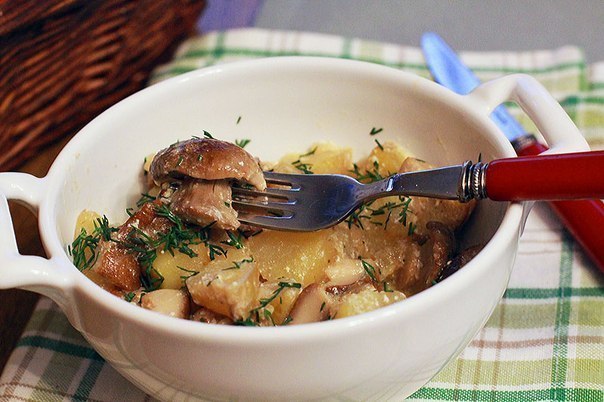 Картофель можно приготовить и с сушеными грибами. В этом случае грибы надо предварительно сварить, нарезать, а затем обжарить вместе с луком. Часть грибного отвара можно использовать для тушения картофеля, остальное для супа.