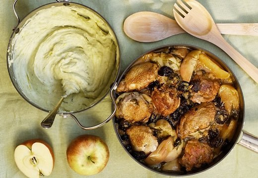Мясо (куриная грудка) режем на кусочки, солим, кладем в горшочек. Яблоко (без кожуры и сердцевины) также режем и вместе с черносливом кладем в горшочек. Заливаем все это стаканом горячей воды. Накрываем горшочек крышкой - и в духовку. Запекаем 40 минут при 180 градусах.