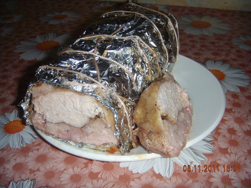 5. Получившийся рулет завернуть в фольгу, обмотать нитками и положить на противень.