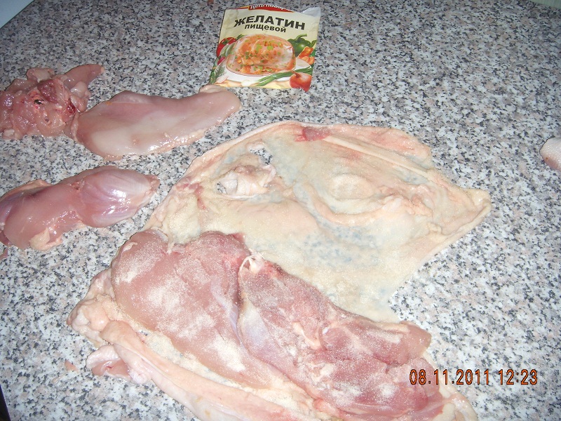 3. Расстелить кожу на столе, посыпать желатином, положить крупные куски, посолить, насыпать специй, желатина, потом положить мелкие кусочки, посыпать специями, желатином, потом оставшиеся большие куски, посыпать солью, специями, желатином.