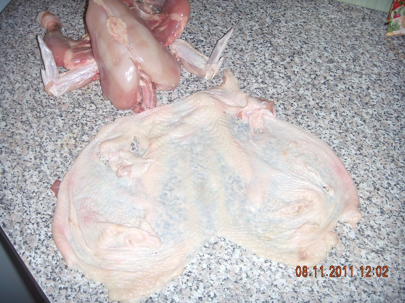 1. Делаем на спинке курицы разрез и аккуратно отделяем кожу от тушки.