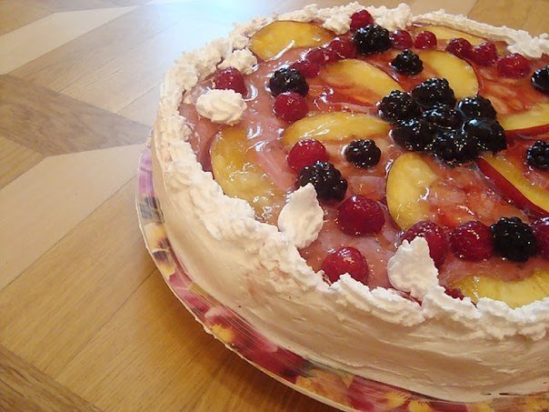 Украшаем оставшимися ягодами и фруктами. Готовим желе для торта и заливаем осторожно ложечкой торт. Даем подтаявшему торту застыть в холодильнике 2-3 часа.