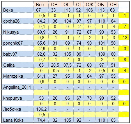вес - 60,1кг рука - 27 грудь - 92 талия - 76 живот - 89 бедра - 94 ляжка - 56 Тренировка 3 раза в неделю в спорт зале (степ аэробика, силовая, танцы)