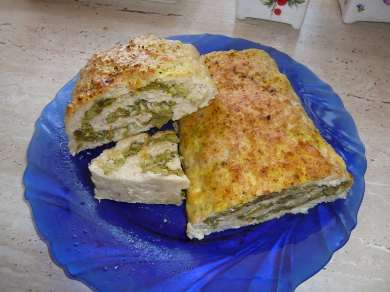 3. Сам рулет: На фольгу прямоугольником выложила фарш (лучше это делать мокрыми руками) толщиной примерно 1 см может чуть меньше. Сверху на фарш выложила начинку. И с помощью фольги закрутила (как роллы закручивают), потом на поддончик и в духовку на 50 мин 200 град. 195 ккал на 100 гр