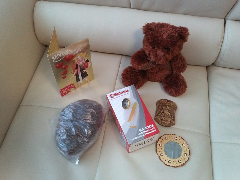 , я даже прыгала до потолка Там орешки кедровые, зеркальце из бересты, магнитик, медвежонок для моей Полинки, открытка с теплыми словами и долгожданная машинка для удаления катышков! Ура Спасибо тебе моя милая волшебница ![]()