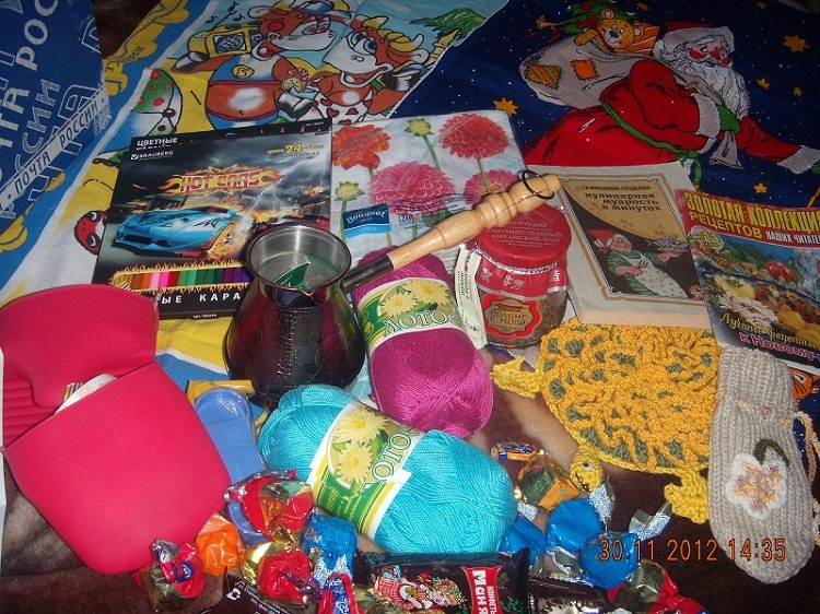 Девочки! Сегодня сбылось мое желание - я получила посылку со своим желанием - все-таки чудеса под Новый год сбываются! Мое желание было - турка, но волшебница Марино4ка постаралась, как всегда (вторую уже посылочку от нее получаю), на славу - чего только нет в моей волшебной посылке!!! Турка, 2 мотка пряжи (уже думаю что связать), 2 книжки с рецептами (одна с рецептами на НГ), интересная мерная ложечка, красивые салфетки, новогодние полотенца, совершенно чудесный чай оолонг с розой, куча вкусных конфет, силиконовые прихватки, Левчику большой набор карандашей, и самое дорогое для меня - связаные Марино4киными золотыми ручками чудесная кудрявая черепашка и чехол для сотового. Черепашка уже висит на кухне, я ее называю Маринка. Чехол уже живет в сумке, а в нем живет телефон.