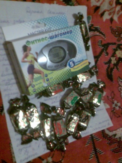 Оля спасибо тебе огромное! Давно хотела шагомер и наконец желание моё исполнилось! Теперь хожу-считаю А конфетки вообще обалденные, смолотили в один присест, очень вкусные, у нас таких не встречала. ![]() (Фото с телефона, так что качество не очень, ссори))