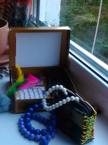 а это то, что было в коробочке! Игрушка для киски(сначала мы с ней поиграли  ,потом разобрались для чего это), наклейки для ногтей и кошелек-сувенир( доча забрала сразу), одеколон для мужчины супер( мы тоже сначала побрызгались  теперь благоухаем, муж получит только завтра - на сутках)Вобщем как всегда все с ног на голову: сначала пробуем - потом читаем и разбираемся что к чему
