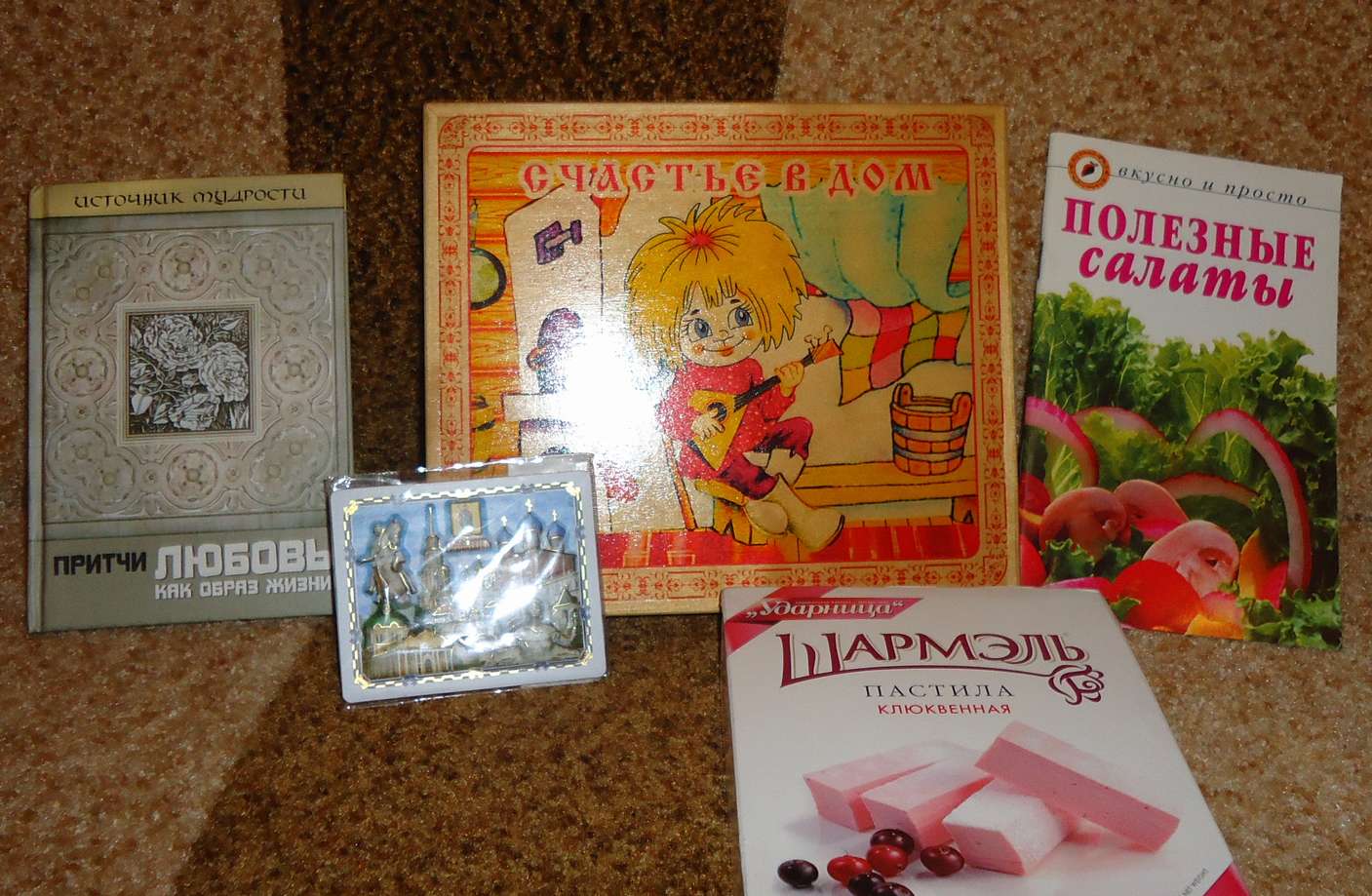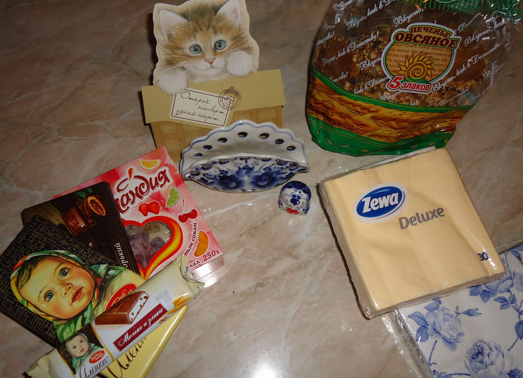 1. Первая волшебница наша Репей Она исполнила желание про ключницу, я об этом уже отписывалась, но фотку не выставила. Все просто замечательное. Ключница суперская, книга с притчами- это что-то, читаю ее постоянно.Пастила наивкуснейшая,книжечка про салаты- тоже очень нужная вещь. Одним словом - все просто замечательное!!!!Спасибо за доставленную радость!!!! 2. Вторая моя волшебница- это Сорокина Марина. Ник не знаю Исполнила мое желание про " В каждом крае или стране.... народные промыслы..." Получила в подарок замечательную Гжельскую салфетницу и котика. Все очень, очень понравилось. Красота неописуемая. Остальные подарки тоже замечательные и нужные. Со сладостями сразу же побежала пить чай. Мармелад и печенье не только очень вкусные, но и полезные! Спасибо огромнейшее Спасибо за теплые слова в ваших письмах!