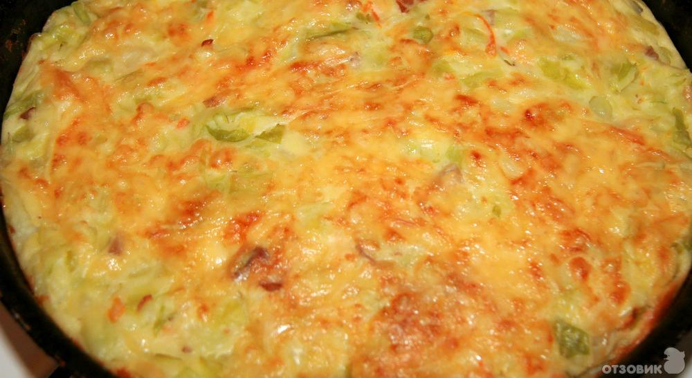 Потом в форму вылила половину теста (форму рекомендую смазать маслом, а то у меня прилипло), выложила капусту и вторую половину теста. Тесто примерно должно быть как на оладьи, у меня чуть пожиже было, но я не стала муки добавлять, чтобы калорийность не увеличивать. И в разогретую духовку. Печь при температуре 180-200 градусов, минут 30-40.