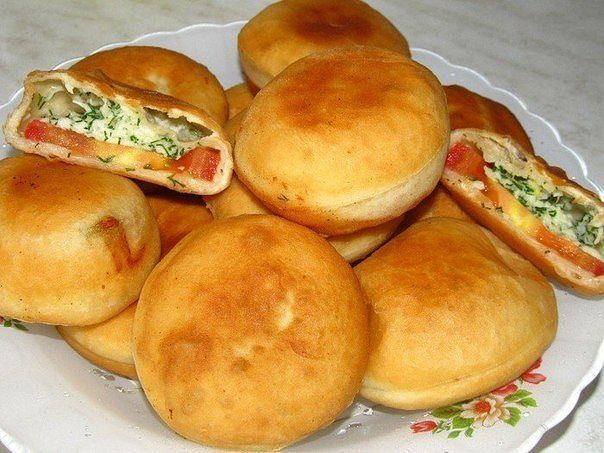 Приготовление: Помидоры порезать кружочками. Брынзу размять вилочкой, если творог то посолить, выдавить через чеснокодавилку чеснок, добавить порезанную зелень и перемешать. В воде (кипятке) размешать сахар и соль, добавить растительное масло. Добавить муку. Вымесить мягкое тесто. Дать тесту отдохнуть 30 мин. Раскатать половину теста в большой тонкий пласт. Разложить на тесто кружочки помидор не ближе чем 3 см друг от друга. На помидор выложить начинку. Раскатать второй пласт теста, накрыть им первый с начинкой. Cтаканом подходящего диаметра вырезать пирожки по контурам каждого кружочка помидора, так поступаем со всеми пирожками. Жарить пирожки в большом количестве раскалённого растительного масла с обоих сторон. Выложить на бумажное полотенце для устранения излишек масла. Приятного аппетита !