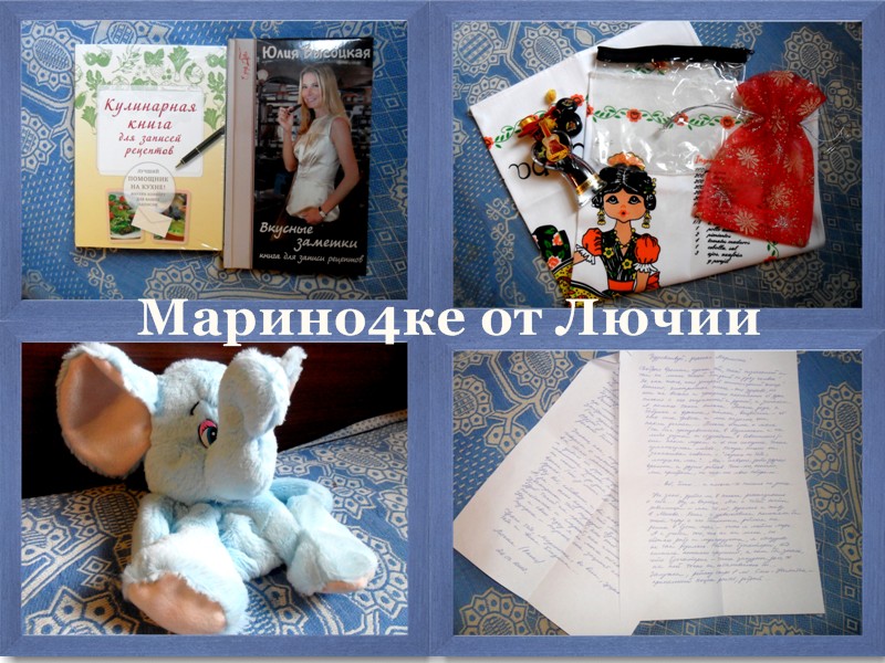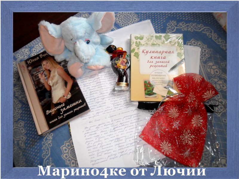 Я сегодня проснулась в приподнятом настроении-вчера собрала посылочку и настроение было отличное от того что несу добро и мой подарочек где-то ожидают... Пришла на почту и была приятно удивлена-мне пришло 3 посылки... Одна от Лючии,а две другие от подруг с кулинарного форума... Вот подарочки от Лючии.Милого,доброго человечка. ![]() И весь подарок вместе... Лючия!Даже не сомневайся-всё очень понравилось и всё пригодится.Я только недавно думала купить себе книжечки для рецептов и отдельную завести для рецептов с калориями.Вот как раз две книжечки и есть... Игрушек таких вообще ни разу не видела-будет Катюше интересно играть. Нет слов чтобы выразить все чувства в моей душе!!!Хочу кричать-СПАСИБО ТЕБЕ ДОРОГАЯ ФОРУМСКАЯ ПОДРУЖКА!!! ![]() ![]() Если кому интересно все мои сегодняшние подарочки можете посмотреть тут http://fotki.yandex.ru/users/m-kurnosov ... um/214881/