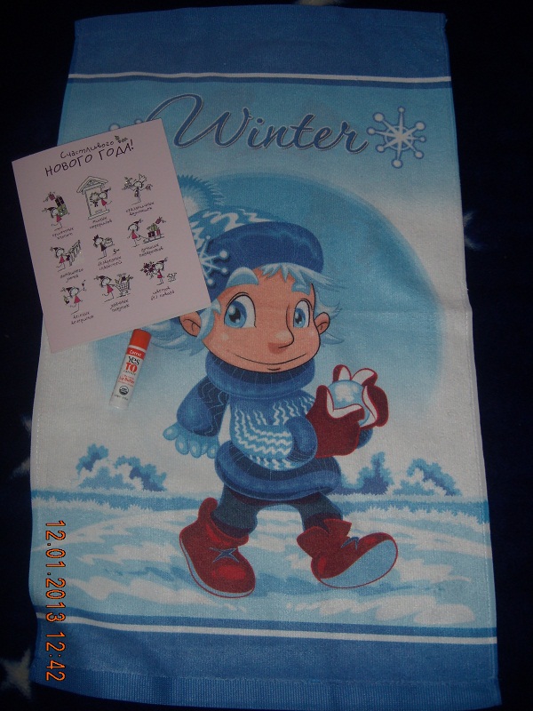 Re: Почта СНЕГУРОЧКИ. Открытки. Доставлено !!!Получила вчера от Лерики бандерольку! Лерика, красавица ты моя, спасибо тебе преогромное!!! Мне было несказанно приятно получить от тебя подарок, на сайте и ты и я редко появляемся, а тут вот так вот протянулась ниточка аж от Комсомольска-на-Амуре до Свердловской области. Больше месяца шло твое послание!.. СПАСИБО, ЛЕРИКА!Очень интересная открытка, зимнее мягкое полотенце и отличный бальзам для губ!