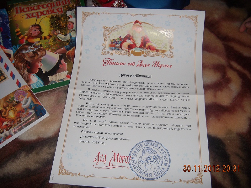 Re: Почта СНЕГУРОЧКИ. Подарки детям. Доставка!Девочки! Я сегодня в радостном шоке - получила сразу 2 посылки с форума!!! Одна - почта Снегурочки! Очень неожиданная и интересная! Посылка и именное письмо Левушке от НАСТОЯЩЕГО ДЕДА МОРОЗА ИЗ ВЕЛИКОГО УСТЮГА!!! Мы в таком радостном удивлении пребываем - не описать словами. Безумно рады! Еще бы - сам Дед Мороз!!! Только вот имени Снегурочки я не знаю... Она, видать, заказ оплатила через интернет и имени ее я не узнала... Отзовись, Снегурочка!!! Хотя есть некоторые предположения...