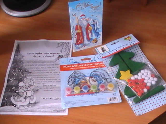 Принесли прямо на дом, даже на почту не пришлось идти! Старшему игрушки на елку для раскрашивания, младшему елочку с игрушками, и открытка с теплыми пожеланиями. И письмо от Снегурочки. Спасибо большое! Еле отобрала игрушки что-бы сфотографировать! ![]()