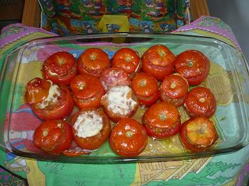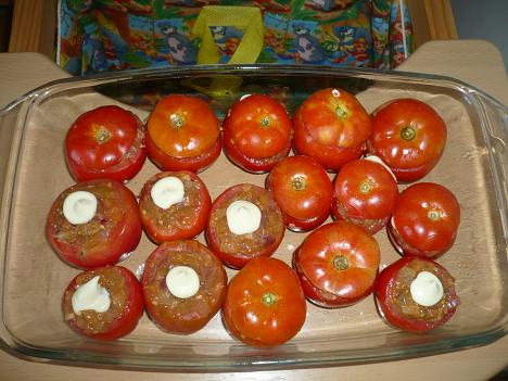 Полученным фаршем наполняем помидоры, поливаем сверху немного майонезом, присыпаем тертым сыром и отправляем в горячую духовку на 15-20 минут при 180 С, или до тех пор, пока не расплавится сыр и не станет золотистым. "Крышечки" кладем сбоку, а затем покрываем ими готовые помидорки.