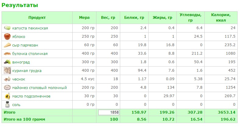 Re: Приближается Новый год. Давайте продумывать меню?Лёльк@, мне кажется, винограда многовато... и хватит ли 200 гр майонеза на такое количество ингредиентов? хотя это всё нужно пробовать)) Мне кажется, выше калорийность будет, но это только эмпирическим путём можно выяснить ;-)