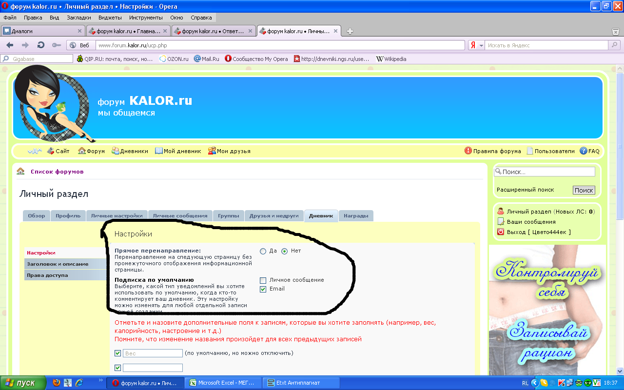 Цвето444ек, не стоит у вас настройка извещений из дневника. Читайте тут http://www.forum.kalor.ru/post791.html#p791