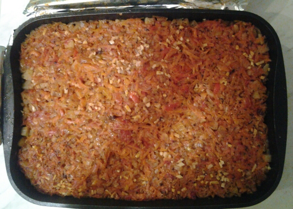 Мелко нарезаем лук репчатый , терем морковь и помидоры очищаем помидоры от кожуры ( для этого , на полминуты обдать кипятком помидоры ,и после очистить,порезать кубиками). Сперва обжариваем лук , далее добавляем морковь , а потом помидоры . И на вкус добавляем базилик ,соль,паприку и зелень. Соус вылить на овощи,измельчить чеснок и выложить поверх соуса,закрыть фольгой , и выпекать примерно час. Ккал посчитать не успела. Всем приятного аппетита !