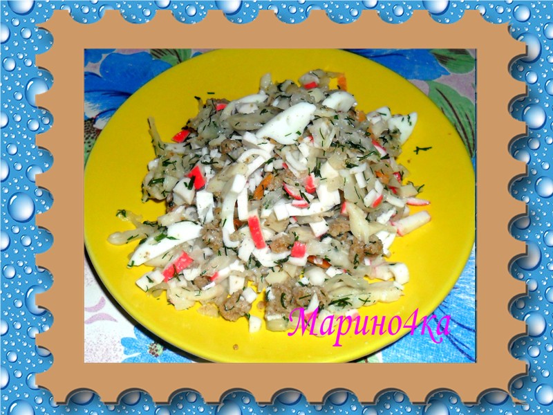 Нарезать крабовые палочки,белки и кальмары по желанию.У меня соломкой.Смешать все продукты и можно есть сразу.