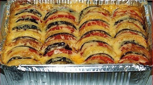 7. Выложите готовые баклажаны в форму для запекания в несколько слоев, полейте томатной смесью и посыпьте оставшимися сырами.