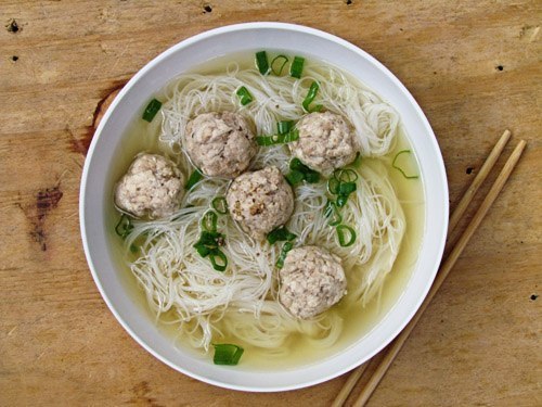 Отварите лапшу и выложите ее в 2 глубоких тарелки. Бульон доведите до кипения. Выдавите чеснок и смешайте с фаршем, перцем, солью, соевый солью. Слепите небольшие фрикадельки и забросьте их в кипящий бульон. Поварите пару минут, а затем разлейте по тарелкам с лапшой. Сверху присыпьте луком и подавайте.