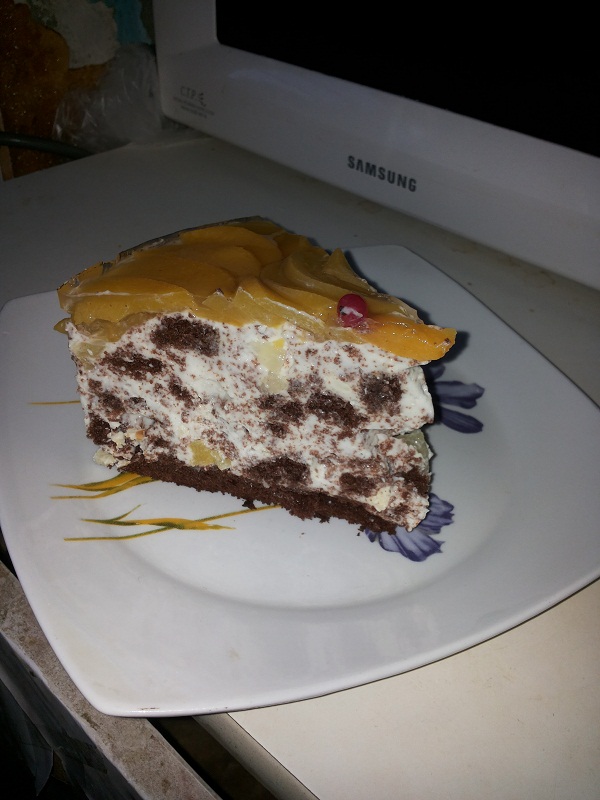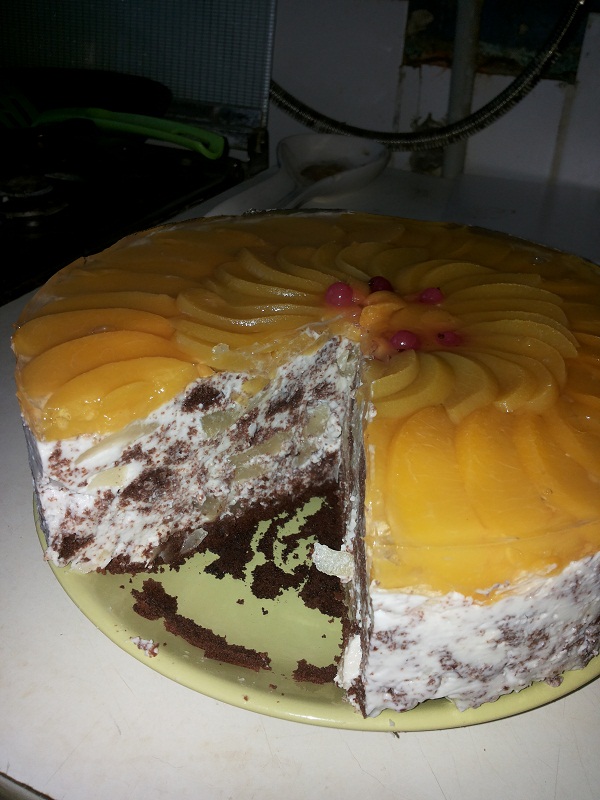 В сиропе от персиков распускаем остатки желатина (5 гр),выкладываем поверхность торта персиками и заливаем сиропом с желатином и отправляем на ночь в холодильник.
