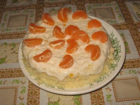 Поле дегустации пришла к выводу, что мандарин или апельсин можно выложить и между коржами, так сочнее.