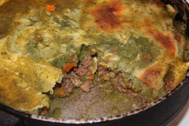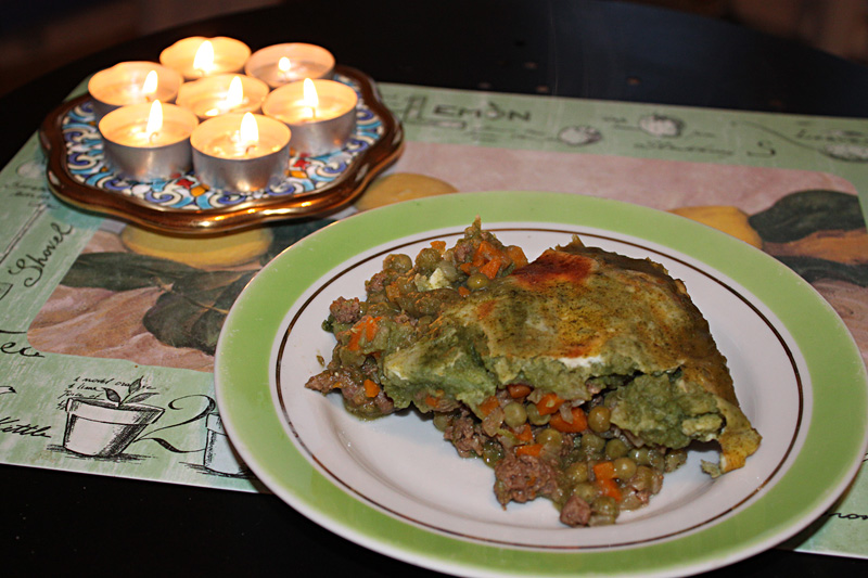 Рецептов такой запеканки много, в двух словах она делается примено так. Готовим густое картофельное пюре, в него добавляем натертый сыр (или без оного). Готовим начинку: поджаривается лук с морковью, потом туда добавляется бараний или говяжий фарш или их смесь, все тушится, потом добавляется горошек.