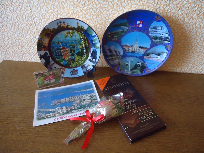 Re: Волшебная почта.Перезагрузка! Доставлено!Девочки, у меня замечательная новость! Я получила посылочку от волшебницы. Ею оказалась Your Insomnia. В желании я просила настенную тарелочку. А получила две тарелочки, на большой надпись "Сочи", на маленькой "Рязань", большущую упаковку шоколада, связанный чай ручной работы с нарядным бантиком, оригинальный магнитик и открыточку с приветом из Рязани.