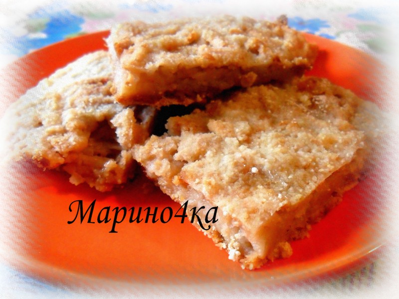 Но,то ли я что-то не так сделала,то ли в такие дни вообще к муке притрагиваться не стоит(у меня КД ),но что получилось-то получилось... Вот мои печенюшки(вместо тортика Сразу скажу-вид на вкус не повлиял-вкус отменный и именно такой как описывала Тётя Агата-яблочный наполеон. Но с приготовлением намучилась и калорийность у меня другая получилась... Но...всё по порядку...Взяла половину рецепта. Перевесила всё на весах. У меня получилось мука 70 гр манка 100 гр сахар 40 гр сода 3 гр яблоки 650 гр Яблоки уже очищенные и без сердцевинок. Сливочного масла не брала вообще (сделала постный вариант). Пекла в форме 30х22 см. Выстелила бумагой для выпечки, посыпала сухой смесью (ничем не смазывала!), выложила половину яблок, немного посыпала сухой смесью и выложила остальные яблоки. Покрыла всё это сухой смесью. Поставила в разогретую духовку (у меня нет градусника, но духовку разогрела как на хлеб, то есть градусов 200-250). Через минут 10-15 в доме стоял аромат печёных яблок. Запах просто сводил с ума!!! А через 40 минут я почувствовала запах немного прижаренных яблок и решила посмотреть на пирог(может пора выключать духовку?). Но верхний сухой слой так и остался сухим, а яблочки начали пригорать. Что делать? Я не растерялась... Вытащила форму на доску и полила аккуратно пирог сверху водичкой (так, чтобы смочить сухой верх). Ушло где-то 200 грамм воды, и снова поставила в духовку... Через 20 минут выключила печь и накрыла пирог газеткой. Оставила до утра. Утром вынула пирог из формы и порезала на кусочки. Так у меня получилось яблочное печенье. Калорийность на 100 гр 128 ккал Белки 2,5 Жиры 0,5 Углеводы 27,8 Считала в калькуляторе калорий. Добавлено спустя 1 минуту 39 секунд: Хочу добавить что печенье очень понравилось и маме и мужу.Нежное,мягкое и такое яблочное!!! Однозначно-буду делать и не раз. Спасибо за рецептик!!! ![]()